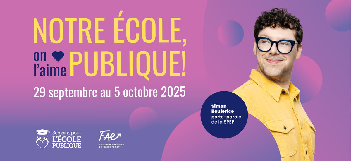 Cette année, comme chaque automne, la Semaine pour l’école publique (SPEP) revient, dans une formule améliorée! Du 29 septembre au 5 octobre, ce sera l’occasion pour toutes les personnes travaillant au sein des écoles publiques du Québec, pour les élèves et leurs parents ainsi que pour toutes celles et tous ceux qui l'ont à cœur comme notre porte-parole, l'auteur Simon Boulerice, de souligner leur attachement à cette institution, d’en faire la promotion et surtout de mettre en valeur son importance cruciale pour la société québécoise.